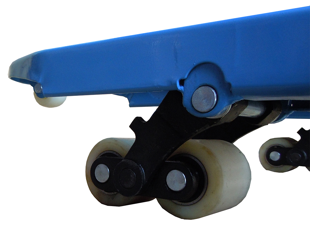 Maximum load limit is 6,500 Lb Heavy gauge steel construction with reinforced underbody pushrods,support heavier loads. Dual 7" polyurethane steering wheels paired with dual load wheels per side for easier movement. 27" x 48" Standard fork dimensions | Lowered minimum clearance of 3"and fully raised height of 7.5"